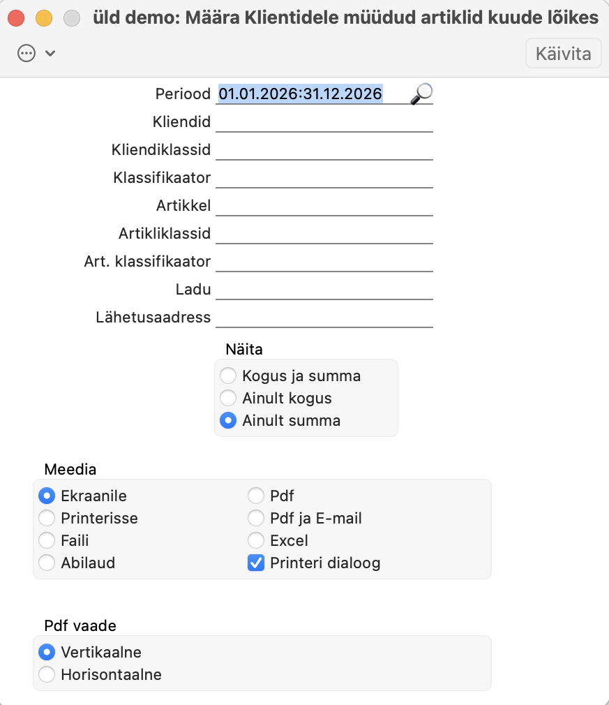 NB! Kui valid “Näita = Kogus ja Summa“, siis saad aruannet vaadata ainult Meedia valikutega: Excel või Fail