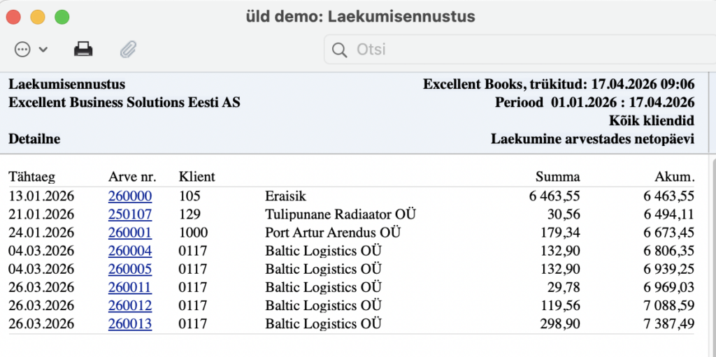 Klient – Kasuta seda välja, et näidata, kui palju on konkreetselt kliendilt laekumata arveid. Aruanne loetleb kliendi tasumata arved, näidates iga arve kohta laekumata summat koos akumuleeruva kogusummaga.