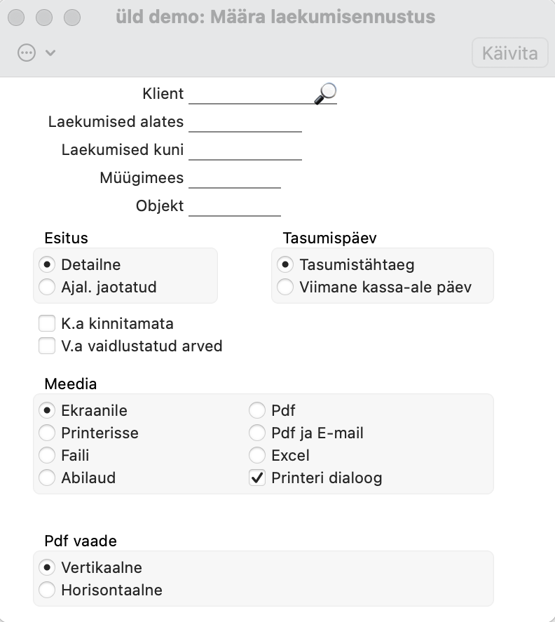 Laekumised alates / Laekumised kuni – Vaikimisi loetletakse aruandes kõik laekumata müügiarved. Kui soovid, et aruandes loetletaks ainult need arved, mille laekumine toimub konkreetsetel kuupäevadel, siis määra see kuupäevade vahemik siin. See piirab aruannet nii, et see annab lähituleviku laekumiste graafiku ja aitab seega prognoosida rahavoogude seisu konkreetsetel kuupäevadel.