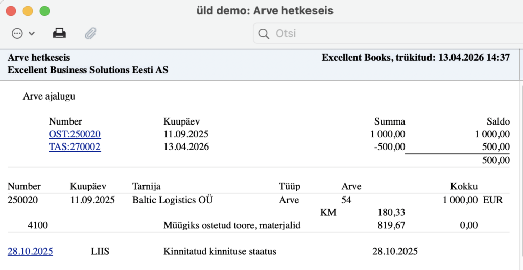 Sama aruanne on võimalik avada ka iga ostuarve peal Operatsioonide menüü alt valikuga ‘Vaata ostuarve hetkeseis’. See prindib ekraanile aruande, mis sisaldab ostuarvel kasutatud kulukontode loendit koos summadega ja näitab valitud ostuarve saldot ehk kas on tasutud tarnijale (täielikult või osaliselt) või krediteeritud. Aruanne sisaldab tasumiste ajalugu.