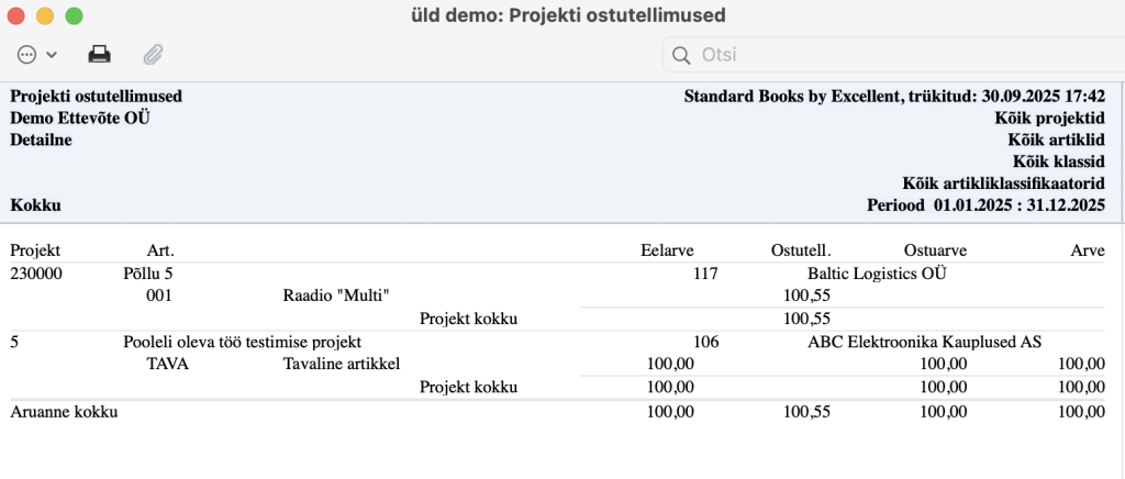 Kokkuvõte – aruanne sisaldab iga projekti kohta ühe rea, kus näidatakse kõigi ostude kogused või väärtused vastavalt “Projekti eelarve” kaardilt, Ostutellimustelt, Projektikannetelt mis koostatud Ostuarvetest, ja arveldatud Projektikannetelt.