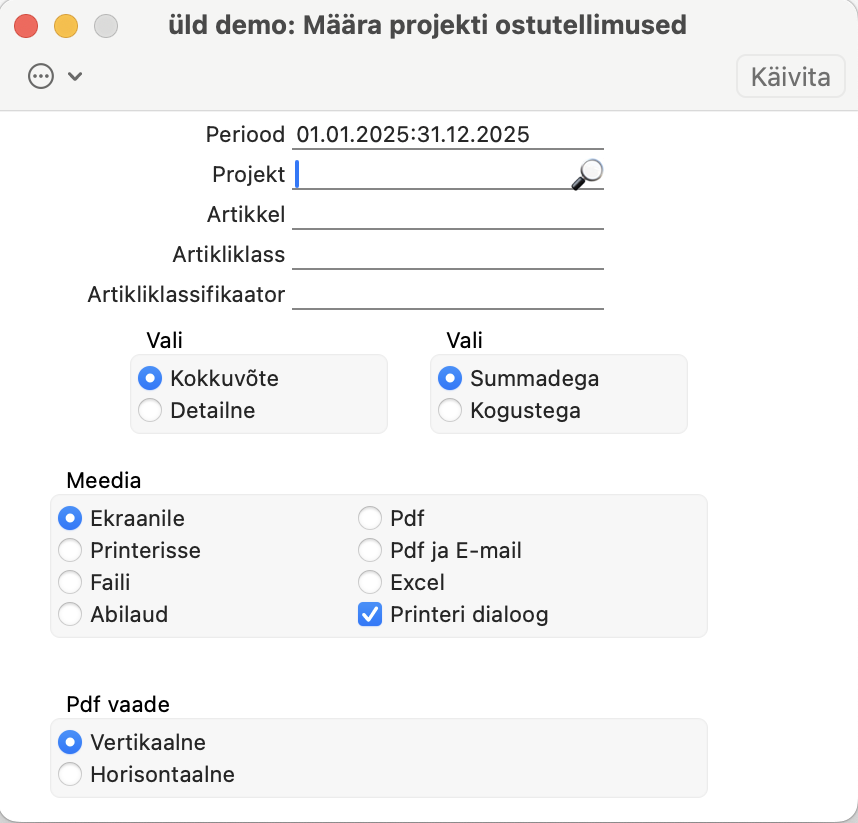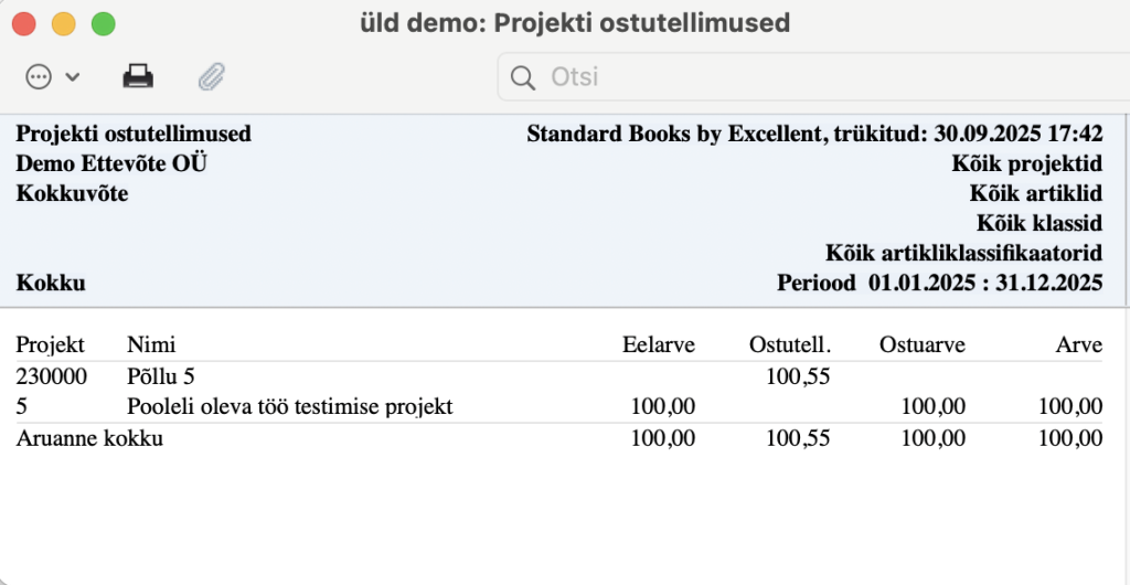 Moodul Projektiarvestus > Aruanded > “Projekti ostutellimused“.