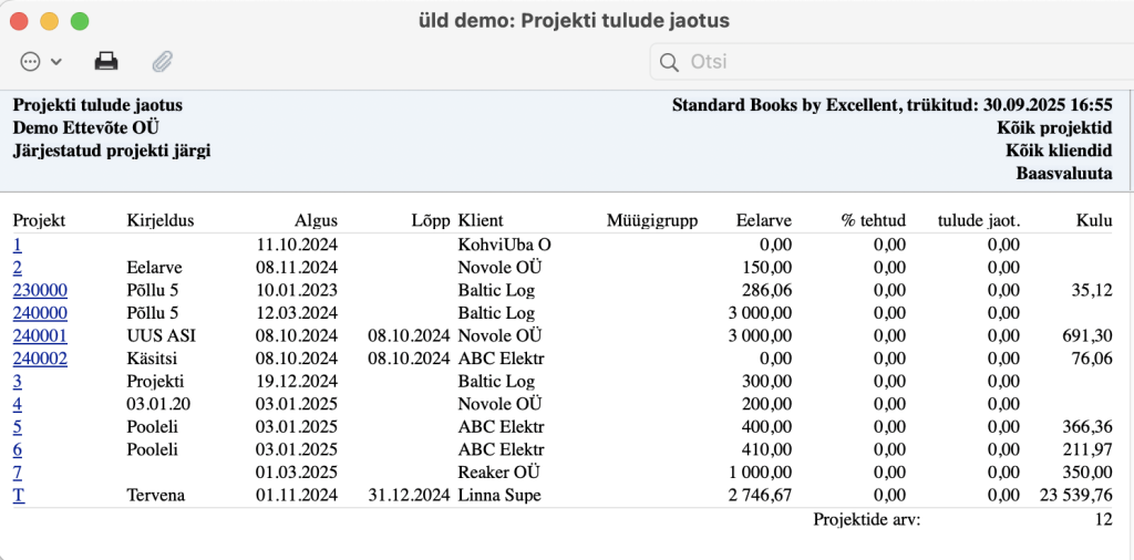 Kui aruanne kuvatakse ekraanile, on seal kasutusel Standard Booksi drill-down funktsioon. Vajuta aruandes Projekti numbril, et avada vastav projekti kaart.