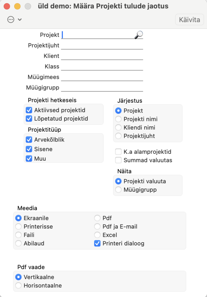 Klient – Kui vajad aruannet konkreetse kliendi projektide kohta, vali siia kliendi Kontakti kood. Võid sisestada ka kliendikoodide vahemiku, eraldades need kooloniga (:).