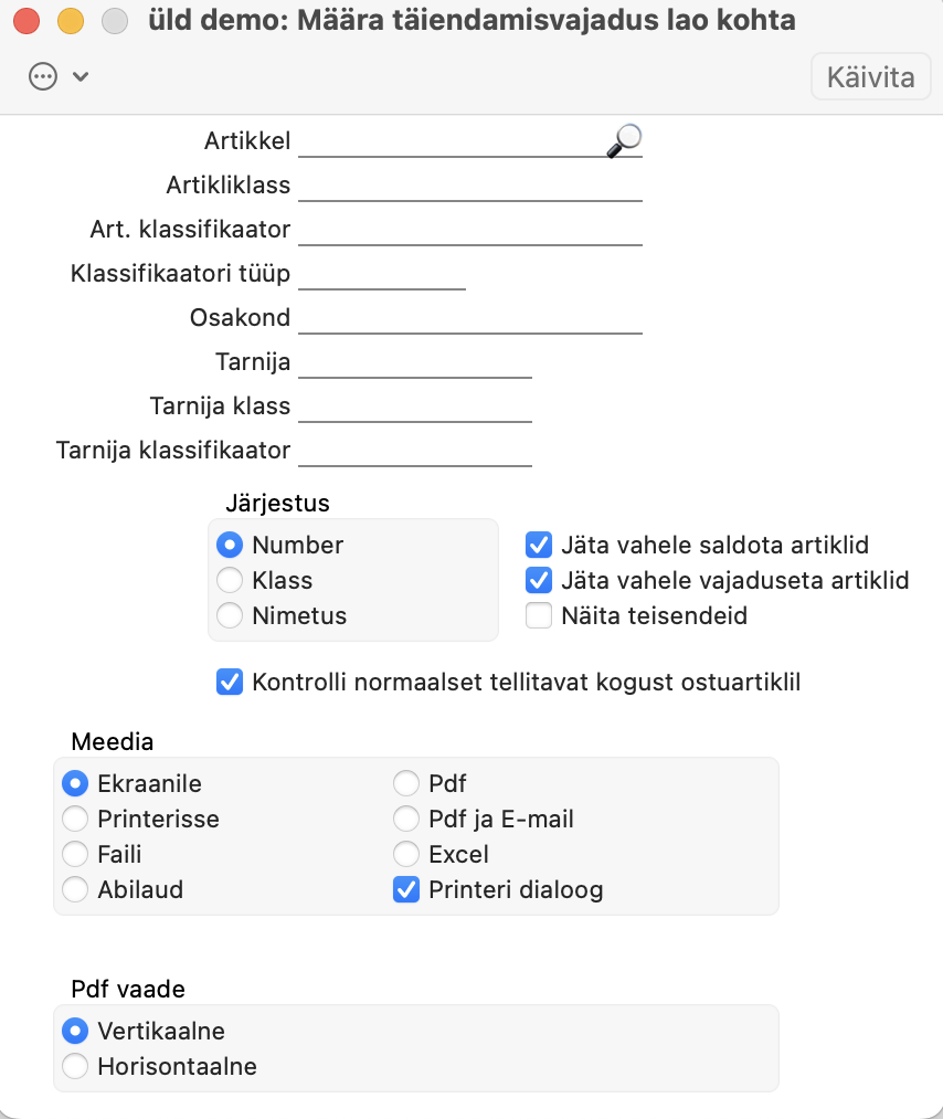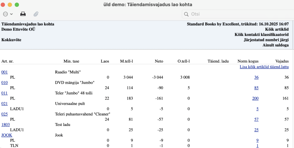 - “Täiendamisvajadus lao kohta” aruanne esitab iga lao täiendamisvajaduse eraldi. Selle aruande alusel saate lisada Artikleid “Täiendamisvajaduse” nimekirja, mis on ostunimekiri, mille alusel saate koosta Ostutellimusi.
