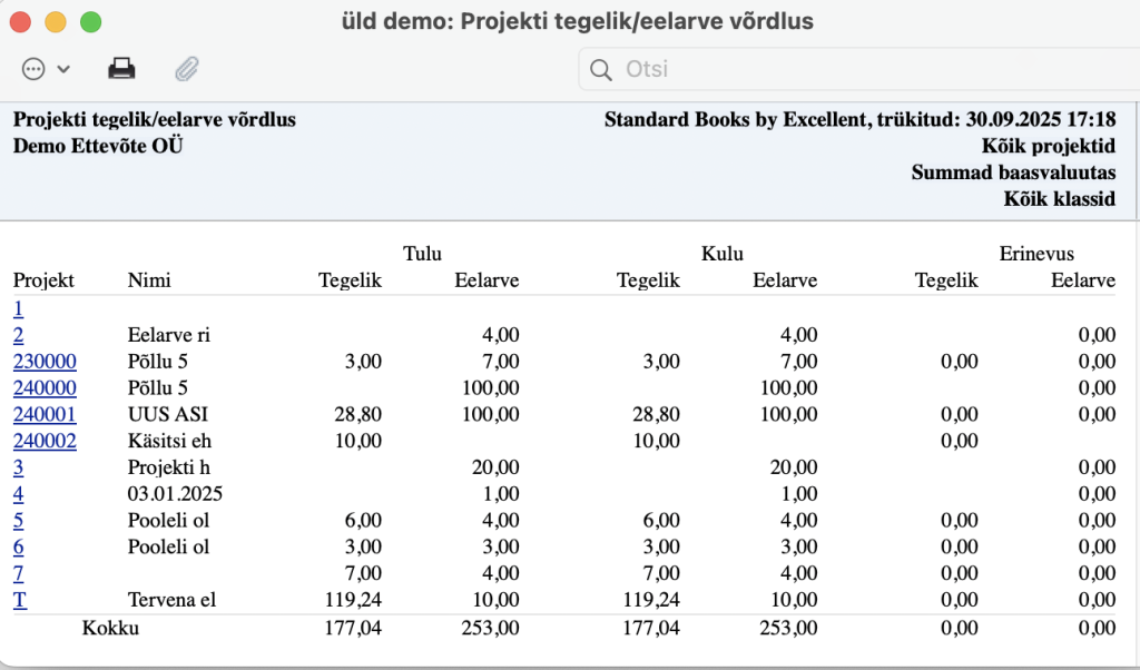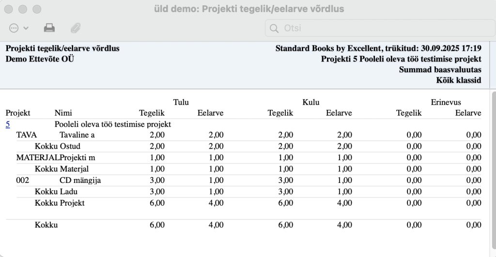 Kokkuvõte – aruanne sisaldab iga projekti kohta ühe rea, kus näidatakse Tegelikke ja Eelarve summasid (või koguseid) tulu, kulude ja müügikatte kohta