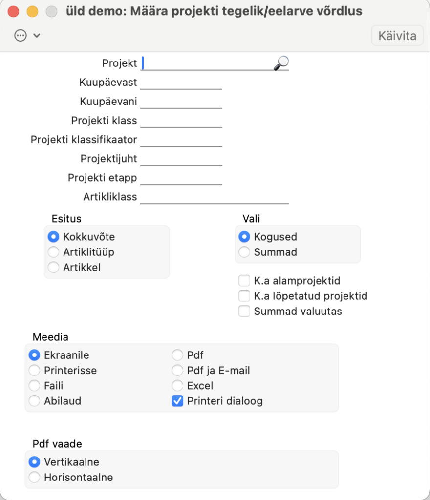 Projekt – Sisesta siia projekti kood või koodide vahemik (eralda kooloniga :), kui soovid aruandesse ainult konkreetseid projekte. Projektid, mille hetkeseis on Lõpetatud, jäetakse aruandest vaikimisi välja, kui sa ei vali allpool valikut “K.a. lõpetatud projektid“.