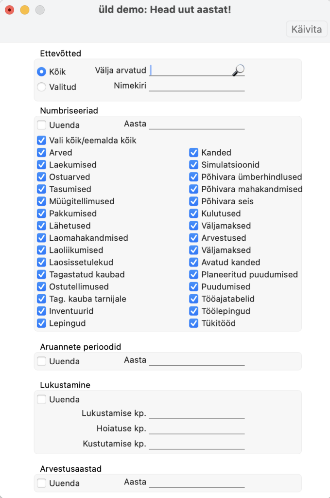 NB! Kui soovitakse see hooldus käivitada kõikide ettevõtete jaoks, mis asuvad samas andmebaasis, siis piisab kui märkida valik „Kõik“.