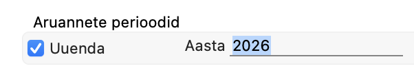 Programm arvestab, millised perioodid on seadistuses eelnevalt olemas. Näiteks, kui aruannete perioodides olid aastad, siis luuakse ka uue aasta kohta ainult aastane periood. Kui enne olid ka kuud eraldi, siis lisab programm uue aasta kohta eraldi ka kuud.PS! Programm kopeerib aruannete perioodide kuu koodid uutele ridadele, mitte ei lisa uusi. Näiteks, kui jaanuar 2025 oli enne koodiga “0125”, siis saab selle sama koodi uue perioodi/aasta jaanuar ehk 01. jaanuar 2026 saab koodiks “0125”. Seetõttu soovitame kuu kaupa kasutada koodidena koode nagu 01, 02, 03 jne või 1, 2, 3 jne.