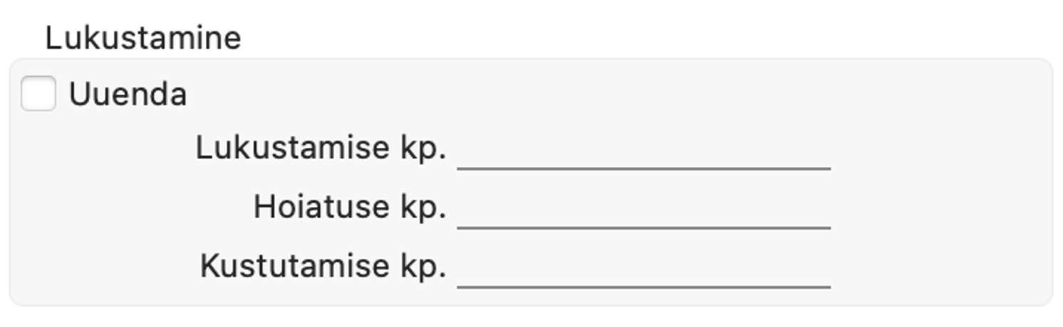 Kasuta neid määranguid, kui soovid, et hooldus uuendaks automaatselt seadistuse “Kuu lukustamine” (moodulis Üldine). Hooldusfunktsiooni saad käivitada mitu korda, vastavalt vajadusele iga osa kohta eraldi. Soovitame kuu lukustamise uuendada uue majandusaasta alguses, kui oled eelneva aasta üle kontrollinud.