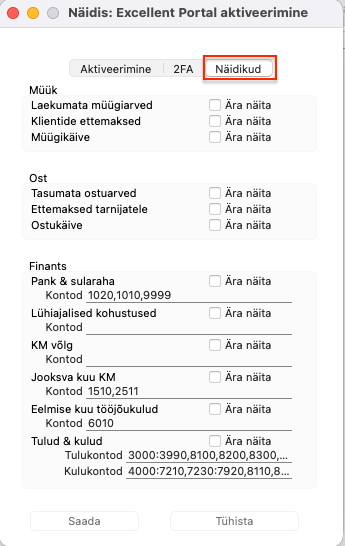 Portali aktiveerimise akna avamisel tuvastab süsteem automaatselt, millised kontod sobivad näidikutele ning täidab väljad võimaluse korral ise. Kontrolli süsteemi poolt tuvastatud kontosid, paranda või eemalda valed kontod, lisa puuduolevad, et näidikud kuvaksid korrektseid finantsandmed.