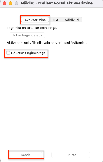 Kui 2FA ja Näidikud vaheleht on üle vaadatud, liigu vahelehele Aktiveerimine ja kinnita teenuse kasutamise tingimused, märkides valik “Nõustun tingimustega” ja vajuta nupule “Saada”.