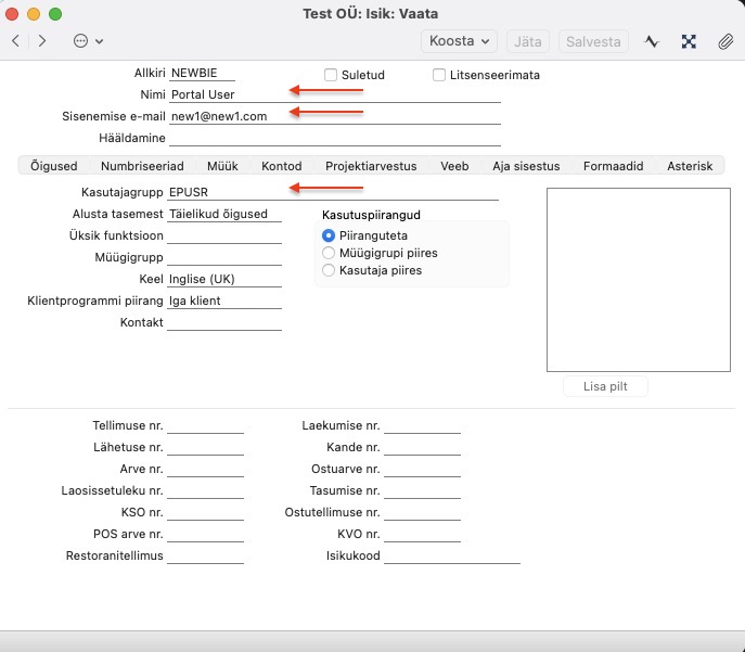 Kui Portali aktiveerimisel valiti valik „Lisa kõigile kasutajatele Portaali õigused”, on süsteem juba määranud kasutajagrupi EPUSR kõigile aktiivsetele Isikutele. - Sisenemise e-mail: See on e-maili aadress, mida kasutaja peab kasutama Excellent Portali sisselogimiseks.