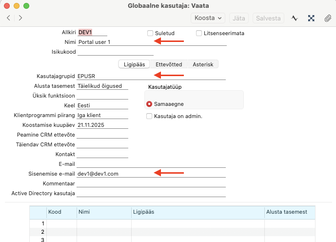 NB! Kui ettevõtete read ehk maatriks on tühi, siis on kasutajal ligipääs kõigile andmebaasis olevatele ettevõtetele ning “Kasutajagrupid” peab olema täidetud ainul globaalse kasutaja kaardi päises.