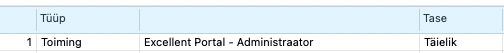 Tüüp=„Toiming” > Toiming= „Excellent Portal – Administraator” > Tase= „Täis”.
