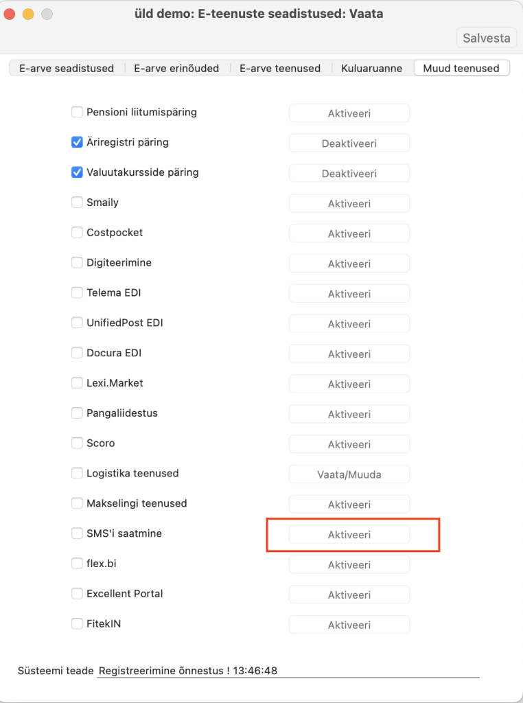 - SMS saatmise e-teenus on aktiveeritud moodulis Üldine > Seadistused >”E-teenuste seadistused” > vaheleht “Muud teenused” > “SMS’i saatmine” real vajuta nupule Aktiveeri. NB! Tegemist on tasulise teenusega, teenuse kasutamiseks võta ühendust müügiosakonnaga myyk@excellent.ee või 669 1113