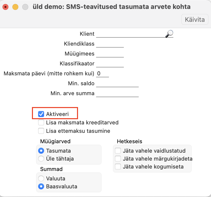 Moodul Müügiarved > Funktsioonid > Hooldus > „SMS-teavitused tasumata arvete kohta“.