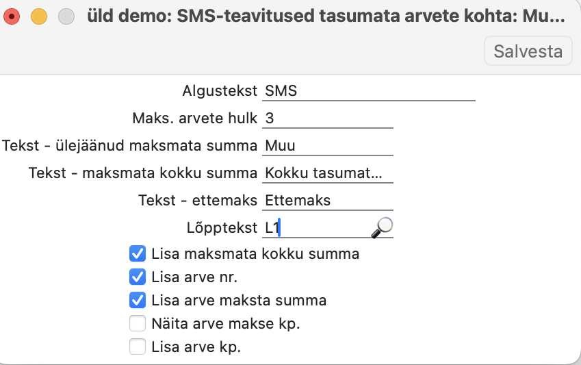 - Täida moodulis Müügiarved > Seadistused > “SMS-teavitused tasumata arvete kohta“. Seadistus peab olema täidetud järgmiselt: