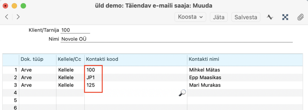 NB! Müügiarvest e-maili koostamisel lisatakse e-maili peale saajateks ainult need, kes on loetletud siia “Täiendava e-maili saaja” kaardile. Kui oled täitnud lahtri “Klient/Tarnija” ja sisestad “Dok.tüüp“, siis asetatakse automaatselt ridadele vaikimisi saajad, sh kõik kontaktisikud ja ettevõtte üldkontakt. Allpool näites saavad kirja Kontakti kaardile määratud “Peamine kontaktisik“(Mihkel) ja Epp ning Mari.