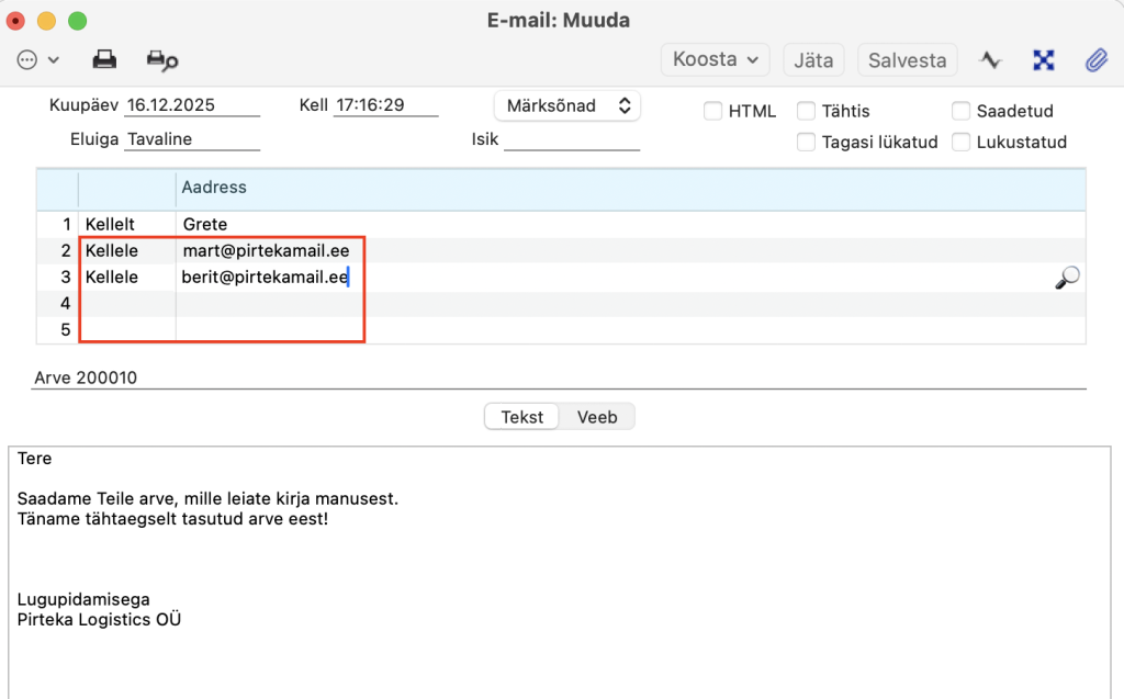 Kui peamisele saajale lisaks on vaja saata müügiarve veel teisele või mitmele kontaktisikule, siis ühekordselt saad sa teisi kirja saajaid lisada e-maili peal. Ava oma Postkastis e-mail ja lihtsalt sisesta käsitsi saaja e-maili aadress eraldi ridadele (väli “Kellele“). Igale reale sisesta ainult 1 aadress. NÄIDE: