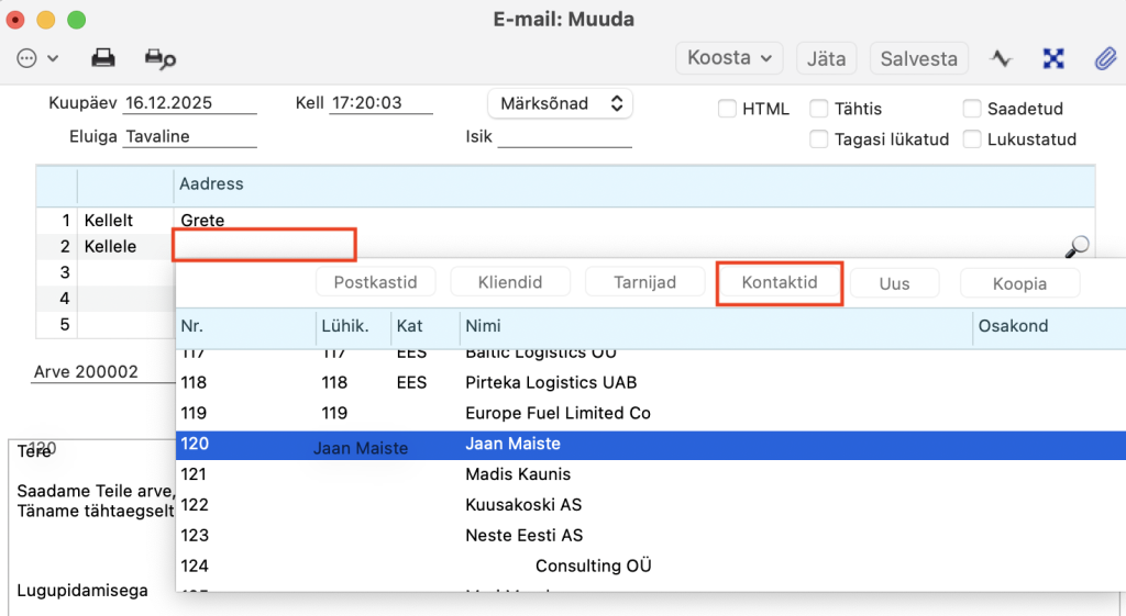 Kui sa oled kliendi kontaktisikud lisanud iga Kontakti kaardi juurde, siis saad e-maili peale valida saajaid inimese nime järgi. Selleks toimi nii: