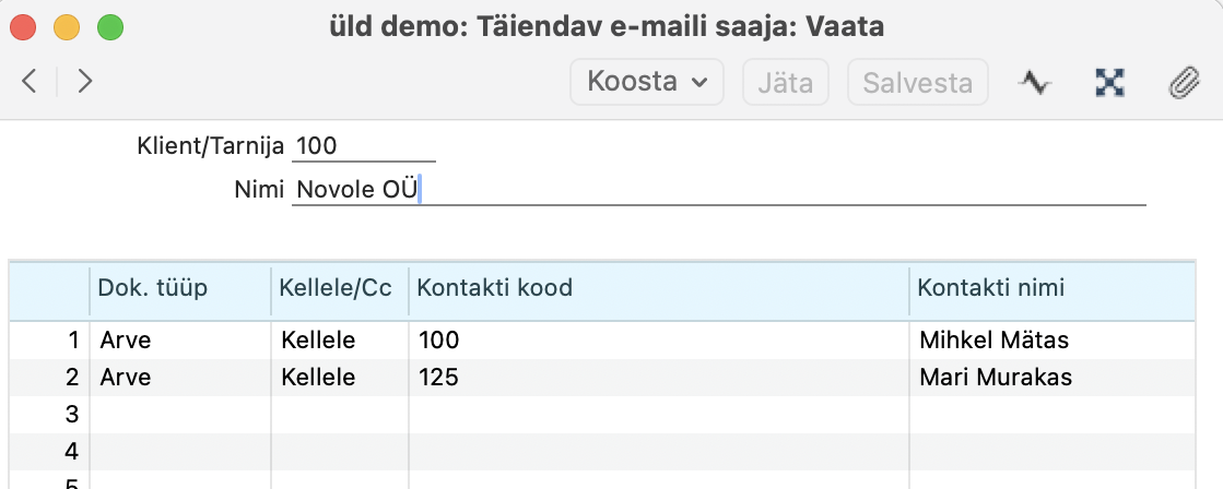 NB! Müügiarvest e-maili koostamisel lisatakse e-maili saajateks ainult need, kes on loetletud siin kaardil. Siin näites saavad ainult Mihkel ja Mari. Kui sa soovid, et e-mail saadetakse ka firma üld e-mailiaadressile, siis pead siia eraldi reale (siin näites 3. reale) valima ka kliendi firma Kontakti kaardi koodi.