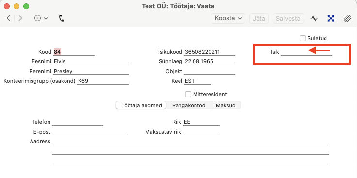 Töötaja kaardil peab olema kindlasti täidetud väli “Isik“.