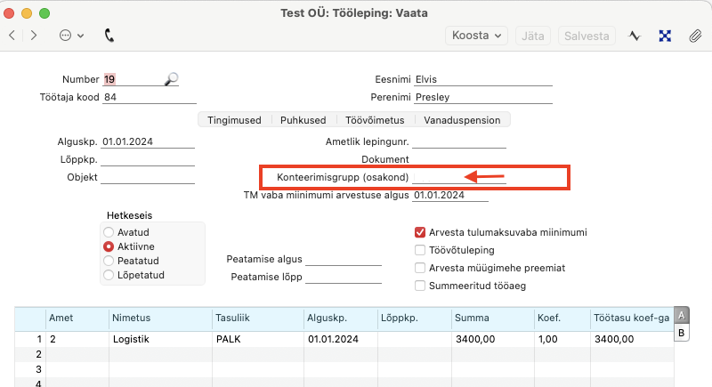 Töölepingu kaardil peab olema täidetud väli “Konteerimisgrupp (osakond)“