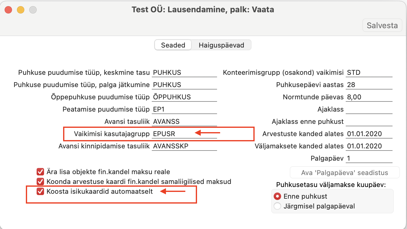 Kui soovid, et edaspidi koos uue Töötaja lisamisega koostaks süsteem ka Isiku kaardi ja uuendaks olemasolevaid kaarte, siis seadistuses “Lausendamine, palk” märgi valik “Koosta isikukaardid automaatselt”
