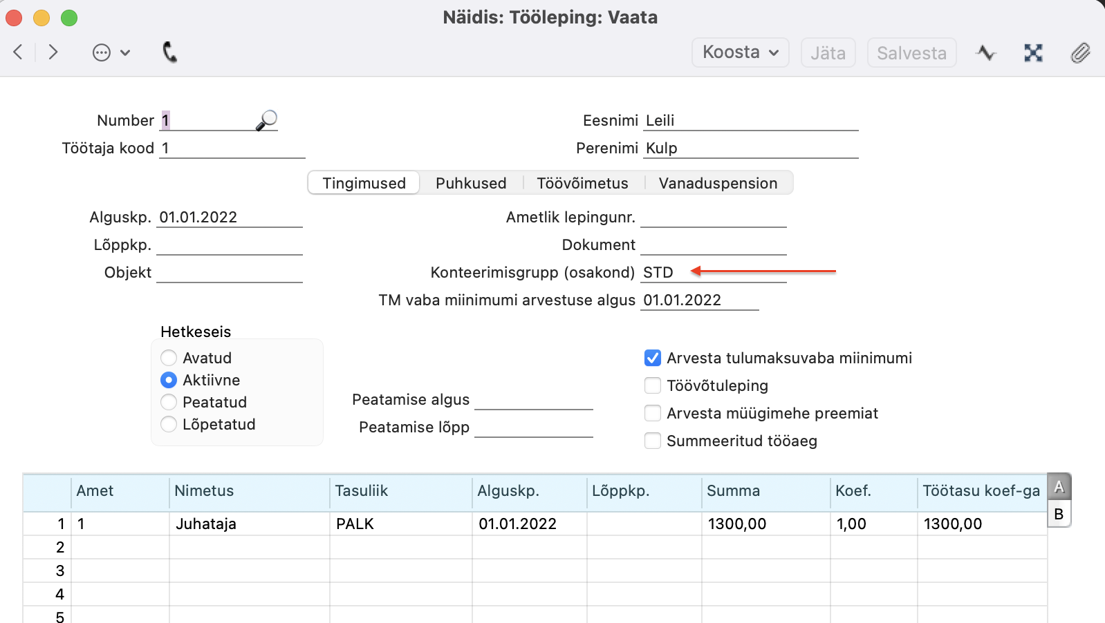 Töölepingu kaardil peab olema täidetud “Konteerimisgrupp (osakond)”.