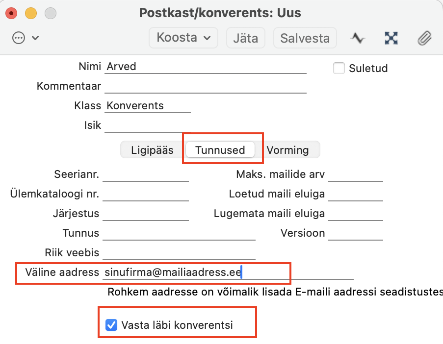 “Väline aadress” (“Tunnused” vahelehel) – sisesta siia e-maili aadress, millelt kiri välja läheb (näiteks, firma@firma.ee).