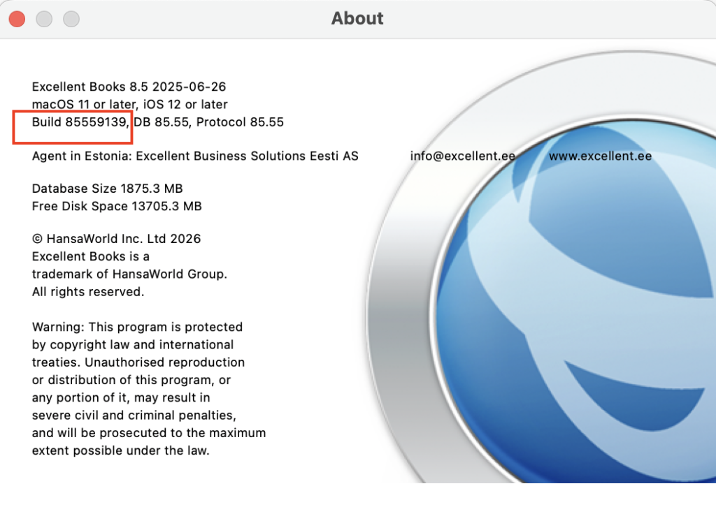 Kontrolli oma Excellent Booksi versiooni, valides programmi ülevalt menüüst “Info” > valik “Info Excellent Books…“