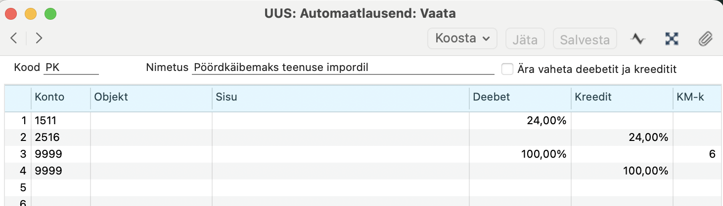 Müügi KM = vali (ctrl+enter) teenuse impordi käibemaksu konto, vastavalt oma kontoplaanile (siin näites konto nr 2516)