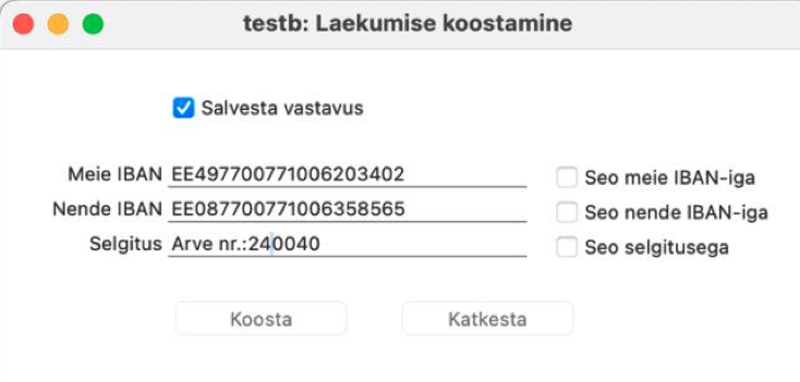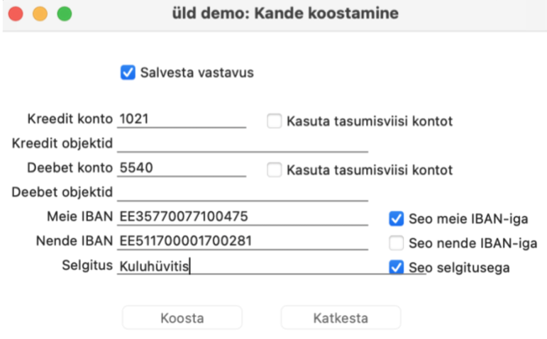 Valides Koosta menüüst „Laekumine“, „Tasumine“ või „Väljamakse“, avaneb lisaaken, mis annab kasutajale võimaluse salvestada vastavus tulevikus saabuvate pangakannete jaoks.