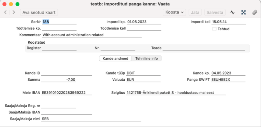 • “Seo meie IBAN-iga” – Books jätab järgmisel importimisel pangakande vahele juhul kui väljal Meie IBAN on sama IBAN.