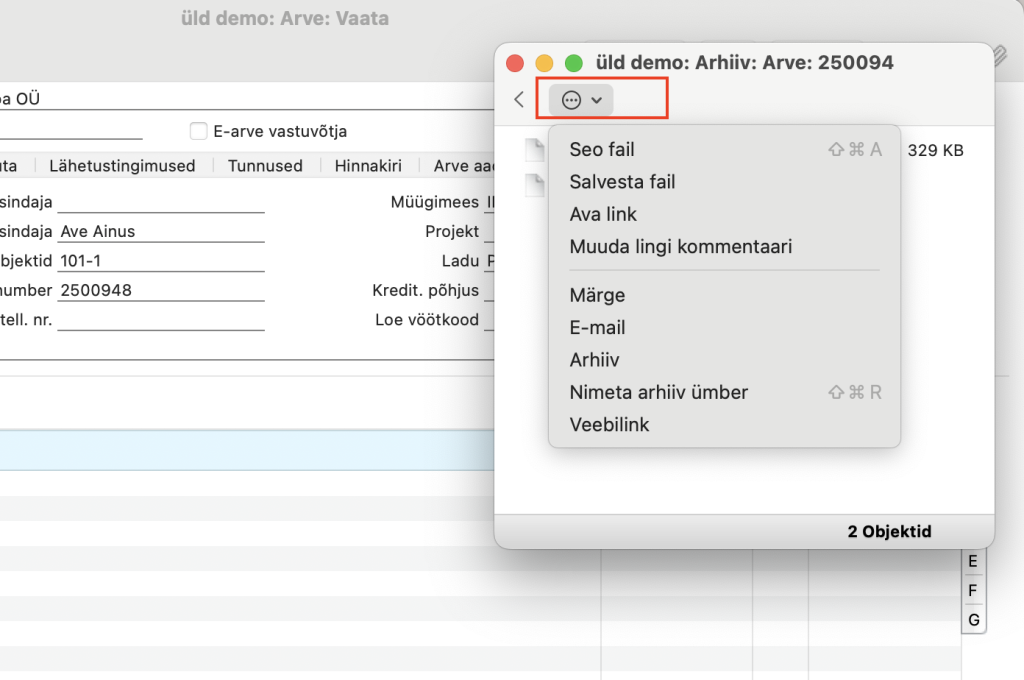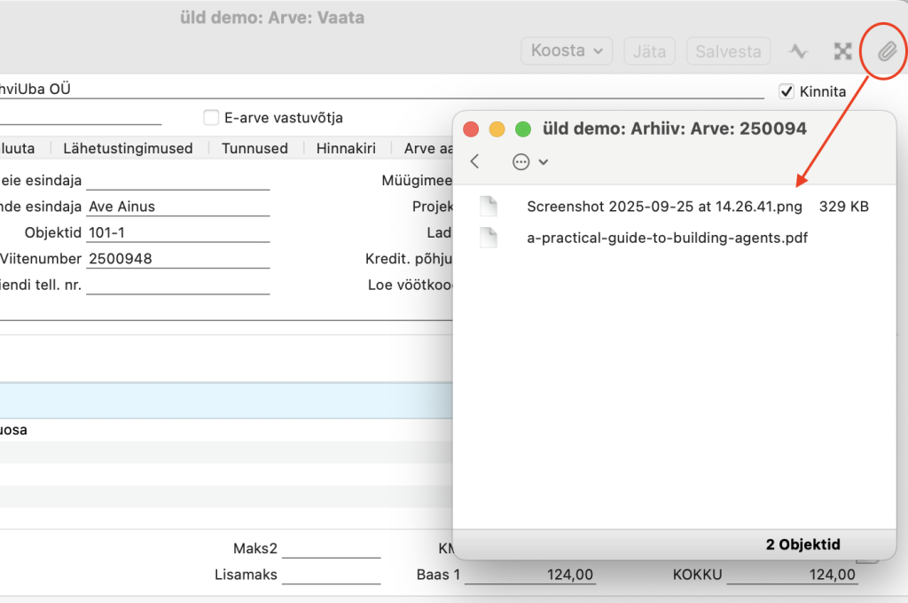 Kirjaklambri ikooni alla on võimalik lisada faile, märkmeid ja arhiive (ehk alamkaustu). Teisi programmisiseseid kaarte, dokumente ja aruandeid saad lisada kirjaklambri kõrval vasakul asuva “Otseteede keskuse” ikooni alla