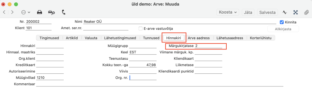 Iga kord kui käivitad Märgukirjade koostamise, muutub müügiarvel (vahelehel “Hinnakiri“) automaatselt vastav kood ehk Märgukirjatase. Märgukirjatase näitab, mitu korda on sellele konkreetsele arvele Märgukirju koostatud.