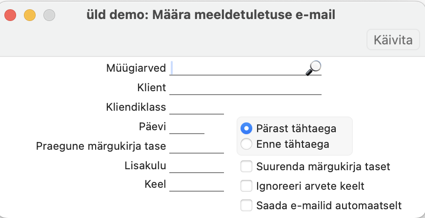 Klient – Vajadusel sisesta siia ühe konkreetse Kontakti kood, kellele soovid Märgukirju koostada. Kui klient ei ole määratud, saadab hooldus 1 e-kirja iga kliendi kohta. Kui klient on määratud, saadetakse 1 e-kiri kõigi määratud kliendi tasumata müügiarvete kohta.