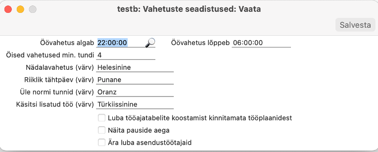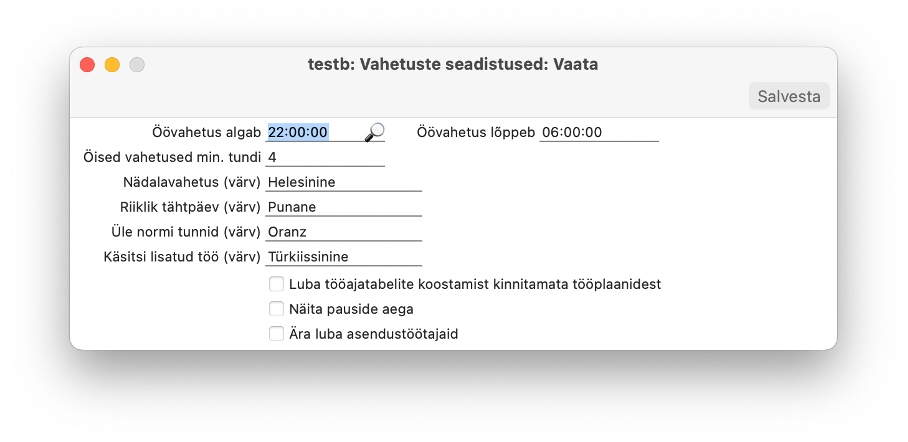 Siin seadistuses saate määrata öövahetuse algus- ja lõppaja. Täitke see seadistus, kui kasutate Töögraafikuid ning Excellent Portal veebikeskkonda. Värvide valik on vajalik vaid portaalis graafiku kuvamisel.