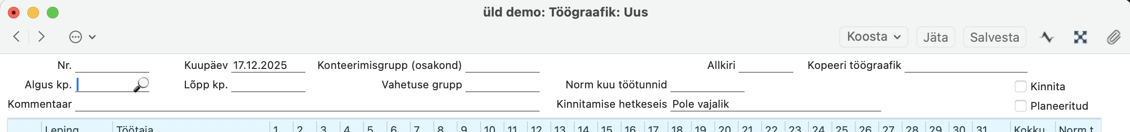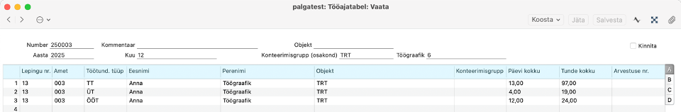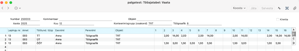 Kui Töögraafik on kinnitatud, siis Koosta menüüst saate koostada “Tööajatabeli”.