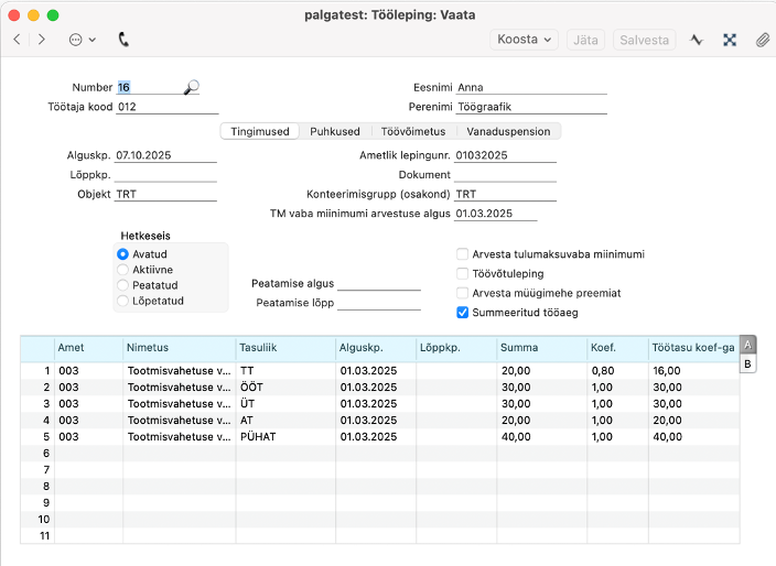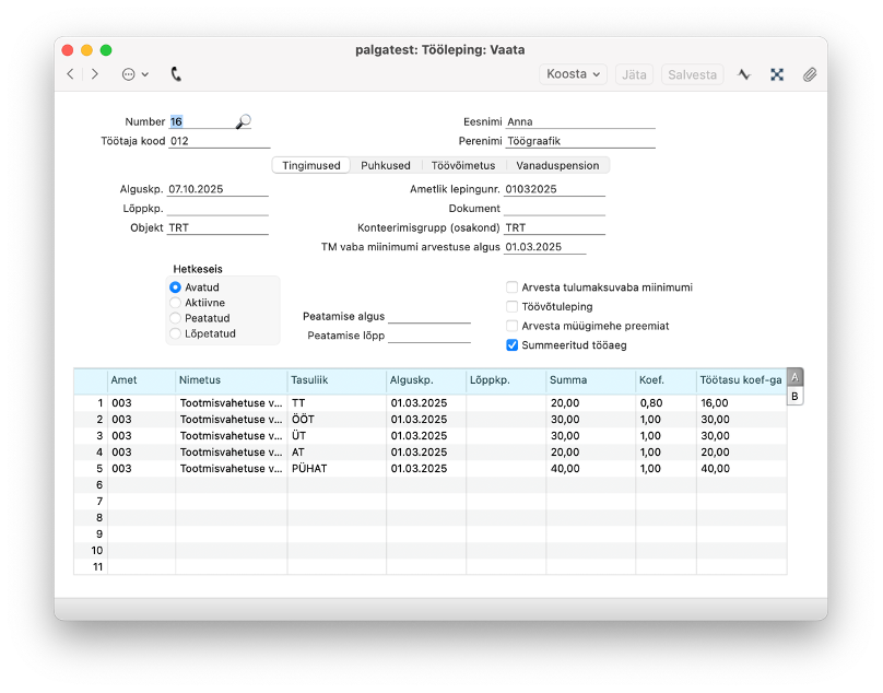 NB! Üle- ja alatundide arvestamiseks peab Töölepingul olema märgitud “Summeeritud tööaeg” ning valitud kõik tasuliigid, mis on lisatud “Vahetuste grupid” seadistusse.