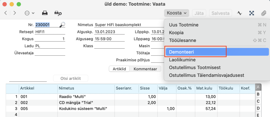 Kui oled tootmise kaardi märkinud Lõpetatud, siis võib tekkida vajadus parandada kaarti. Sellisel juhul saad kasutada Koosta menüü valikut “Demonteeri”.