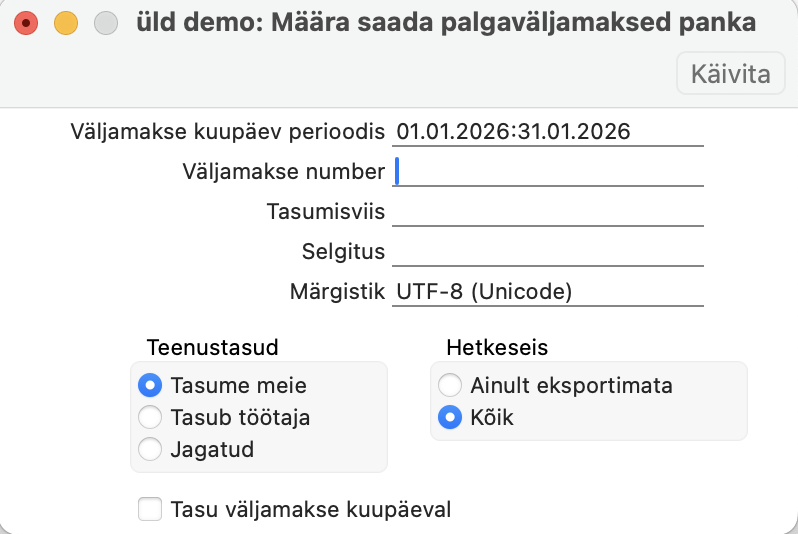 Kui soovid vältida ekslikult kõikide väljamaksete saatmist panka, k.a juba pangast väljamakstud töö- ja puhkusetasud, siis märgi valik “Hetkeseis = Ainult eksportimata“.