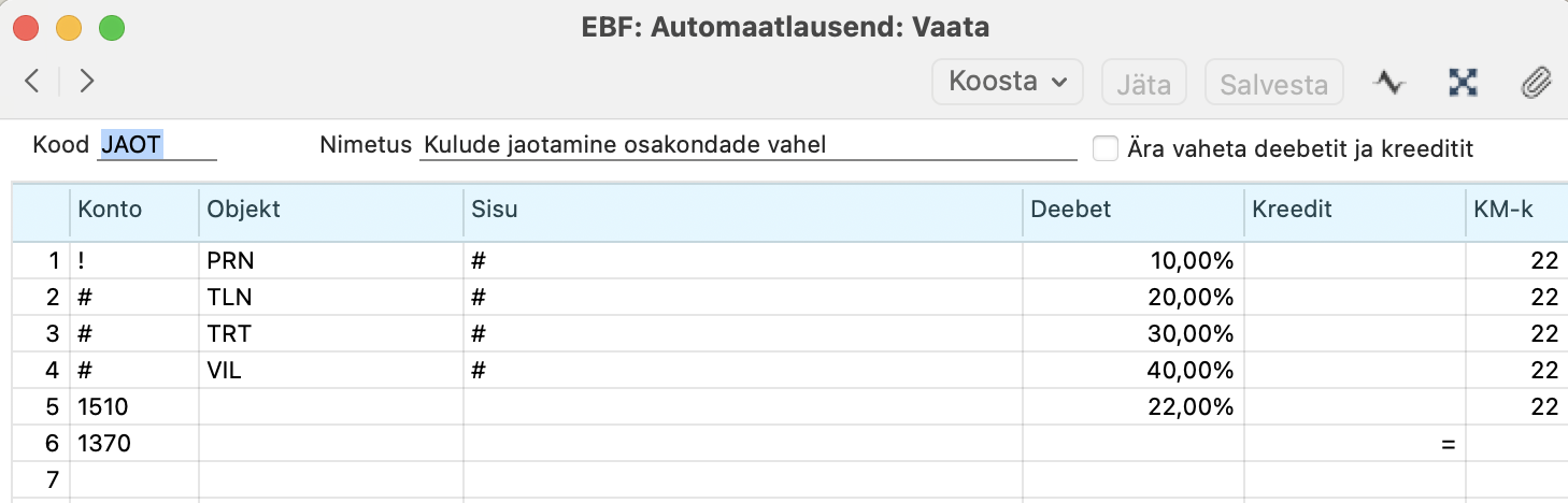 Näide 7: automaatlausend, kui kulu jagamine toimub 3 osakonna vahel, erinevad proportsioonid: