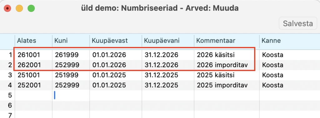 - Sama registri numbriseeriad ei tohi omavahel kattuda käsitsi ja automaatse impordi jaoks.