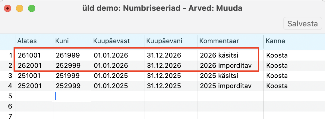 Kui sul on aktiivse perioodi jaoks mitu numbriseeriat vaja kasutada, siis pane kõige ülemisele ehk esimesele reale see numbrite vahemik, mida soovid, et programm vaikimisi kasutab. Dokumendi peal saad käsitsi valida kõiki aktiivse perioodi numbriseeriaid. Tühja rea lisamisest kõige ette loe SIIT