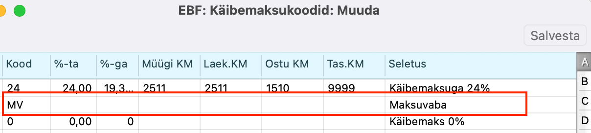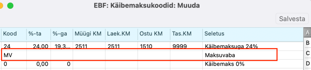 Veendu, et siin seadistuses on lisatud eraldi käibemaksukood (peab olema erinev 0% määra koodist). Selle käibemaksukoodi (KM-koodi) real jäta tühjaks protsendi veerud (“%-ta” ja “%-ga”). Näide: