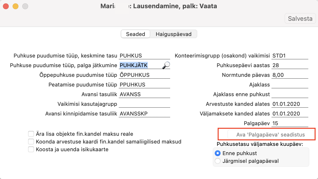 Kui see tabel on tühi, siis kasutatakse kõigi töötajate puhul ühist kuupäeva “Lausendamine, palk” seadistuses määratud “Palgapäev” (ülevalpool näites 15).