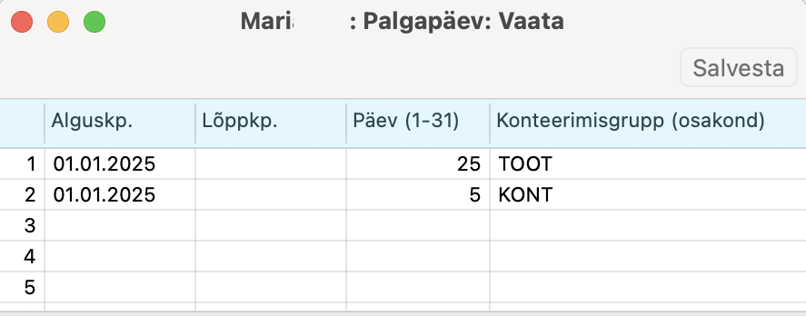 Kui on vaja määrata uus palgapäev, tuleb eelnevale reale määrata lõppkuupäev (“Lõppkp.”) ning lisada uue palgapäeva jaoks uus rida uue alguskuupäevaga (“Alguskp.”). Nii säilib korrektne ajalooline info ja süsteem kasutab alati viimast kehtivat reeglit.