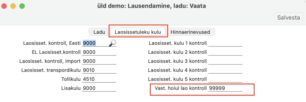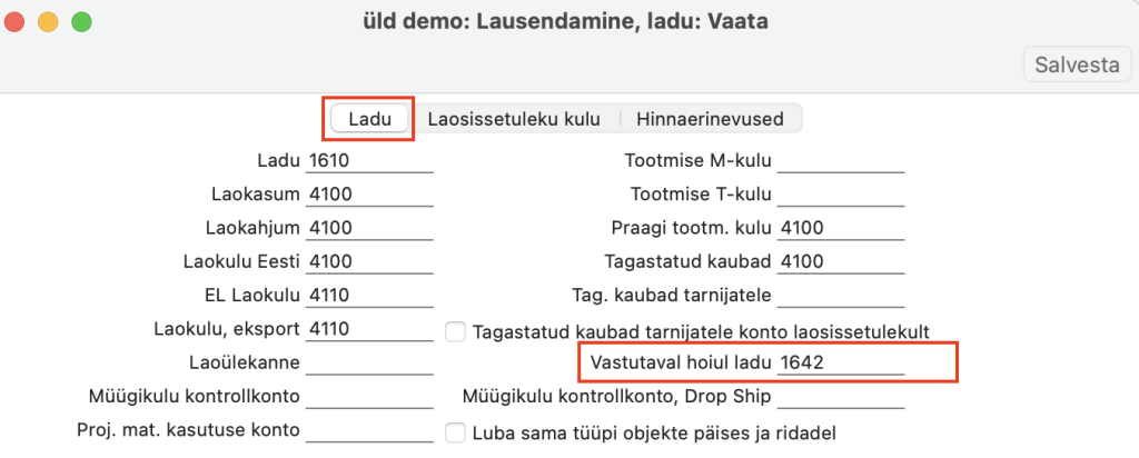 - Moodulis Logistika seadistuses „Lausendamine, ladu“ määra konto „Vastutaval hoiul ladu“ (vahelehel „Ladu“) ja konto „Vast. hoiul lao kontroll“ (vahelehel „Laosissetuleku kulu“).